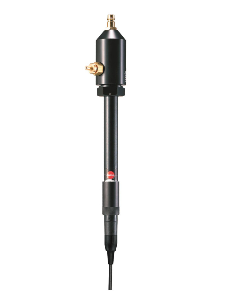 Sonda de combustión con vaina de 300 mm y diámetro de 8 mm. Incluye cono de sujeción y manguera flexible de 650 mm. La manguera es un avance respecto a las anteriores porque es más corta y más flexible, lo que facilita el acople al analizador y a la chimenea. Esta sonda también se puede acoplar a la chimenea mediante el soporte especial testoFix (accesorio opcional no incluido).