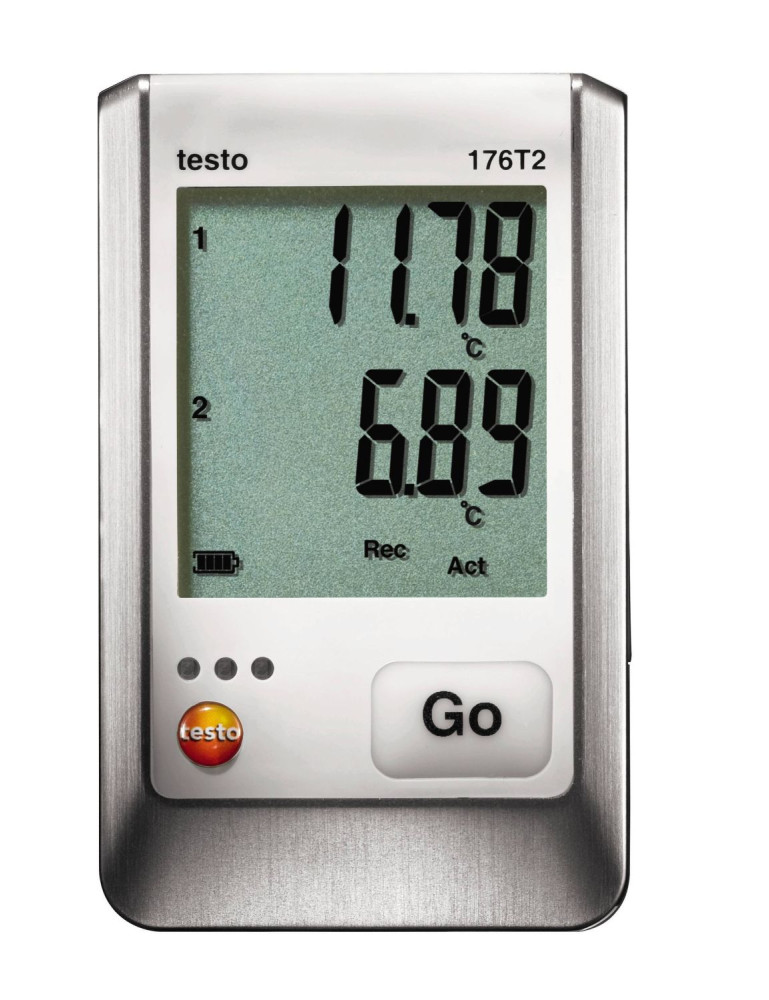 El testo 176 T2 destaca por su pantalla LCD para ver los valores medidos en ese momento, la carga restante de las pilas y los valores máximos y minimos registrados. Al poder conectar dos sondas Pt100 el data logger puede registrar los valores en dos lugares simultáneamente con la máxima exactitud.