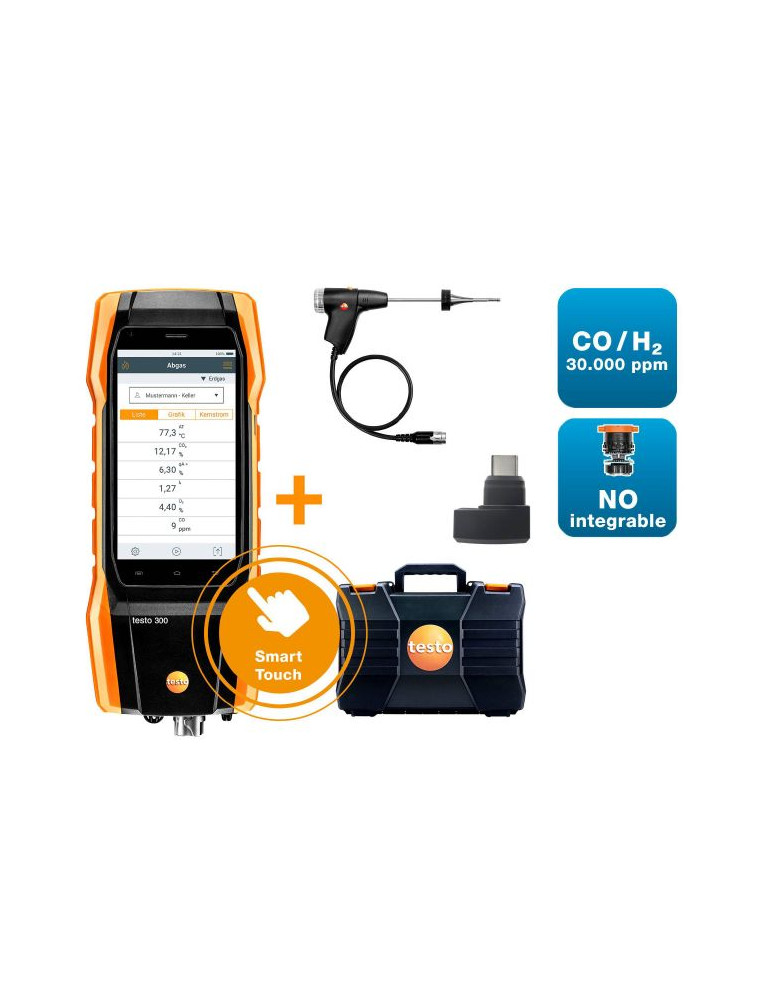 Mediciones durante todo el dia sin problemas con el analizador de gases de combustión que incluye sensores LongLife. El analizador de combustión testo 300 Longlife "NEXT LEVEL" (certificado por el TÜV) se entrega con sensor de O2 y sensor de CO con compensación de H2 hasta 30.000 ppm, sonda de combustión modular certificada por el TÜV, maletín y accesorios prácticos entre los que se incluyen el nuevo conector Bluetooth testo.