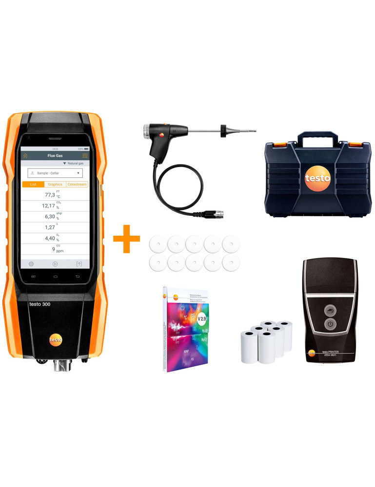 Utilice, por ejemplo, vainas largas para chimeneas con un diámetro más grande o vainas flexibles para puntos de medición de difícil acceso ? Sondas y accesorios disponibles opcionalmente para otras tareas, como la medición de la presión del gas, test en las tuberías del gas, medición de temperatura diferencial o la medición del CO ambiente Inteligente, intuitivo, eficiente: manejo sencillo en el trabajo diario ? Pantalla Smart Touch para el manejo intuitivo del analizador de combustión: la pantalla reacciona sin retardos, igual de fácil que en su smartphone ? Obtenga el resultado de la medición más rápidamente gracias a los menús de medición claramente estructurados para todas las mediciones relevantes ? Creación de documentación (incl, datos sobre los valores medidos, el lugar de medición y el cliente) fácilmente in situ ? Almacenamiento de mediciones en PDF directamente en el instrumento y siempre disponibles ? Función de firma: el cliente puede firmar los informes de medición directamente en el instrumento ? Envío de informes de mediciones vía WiFi (Hotspot) por correo electrónico directamente a la oficina o al cliente ? Gran pantalla HD de 5 pulgadas, de este modo se visualizan todos los parámetros del sistema ? Función de interfaz Testo para una transferencia de datos directa de los valores medidos a un software industrial estándar o un software específico del cliente* ? Uso inmediato: en modo standby, el testo 300 está listo para medir con tan solo pulsar un botón.